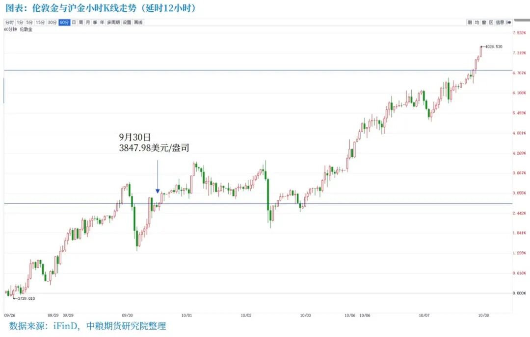国庆假期期间,海外市场的多重因素共同推动伦敦金价格站上4000美元/盎司的历史性关口,截至10月8日12:55报4024.18美元/盎司,较节前(9月30日15:00)上涨约4.58%。
